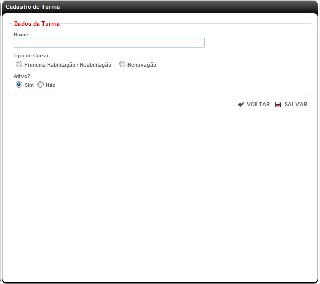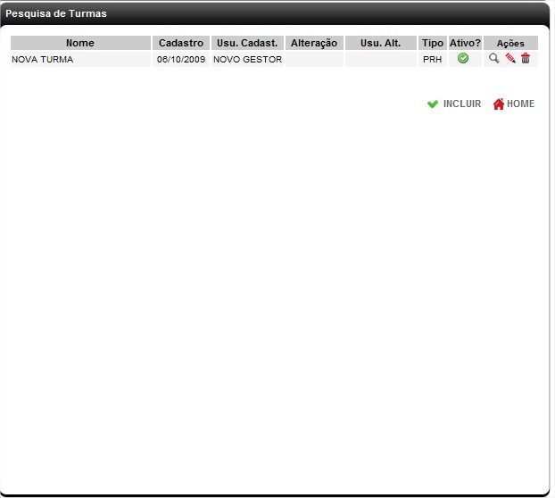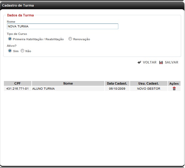 6- Após o cadastramento de uma turma, quando o menu de “Turmas” for acionado novamente, o sistema apresenta as turmas cadastradas para o CFC e permite a manutenção das turmas listadas.