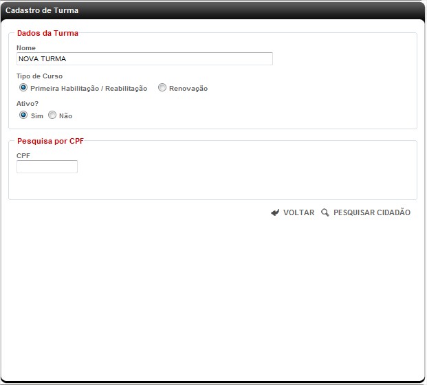 3- Após o preenchimento e inclusão dos dados da turma será apresentado um campo para que seja informado o CPF do cidadão que será relacionado a turma. |