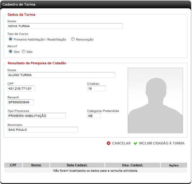 4- Ao informar o CPF do cidadão e selecionar a opção “Pesquisar Cidadão”, o sistema apresenta os dados básicos do cidadão para identificação e o usuário clica em "Incluir Cidadão à Turma".