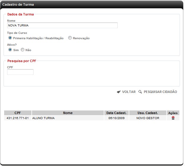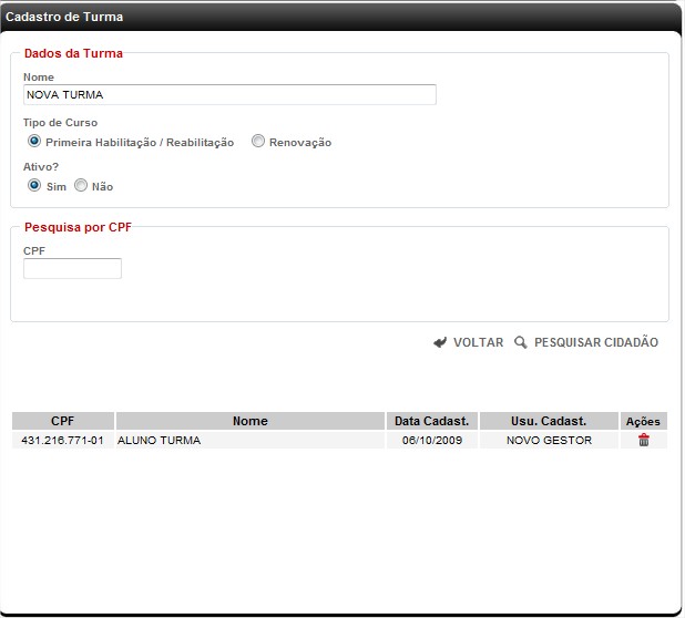 5- Após Incluir o cidadão na turma, o sistema apresenta o cidadão em uma grade, permitindo a sua exclusão ou que seja informado um novo cidadão para aquela turma.