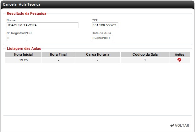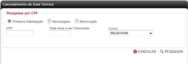 Cancelar Aula Teórica Este item permite o instrutor teórico cancelar uma aula registrada indevidamente para um determinado cidadão caso a aula esteja em aberto. 1-Para o cancelamento da aula, o usuário deverá informar alguns dados da aula registrada. |
