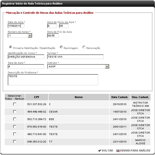 a) Data da Aula: Informe a data da aula em que ocorreu o problema de envio; b) Hora de Início da Aula: Indique a hora correta de início da aula (hora e minutos); c) Número de Aulas: Selecione a quantidade de Aulas dadas; d) Hora de Fim da Aula: O Sistema calcula a partir do número de aulas; e) Tipo de Processo: Selecione Primeira Habilitação/Nova Habilitação - Permissionário Pontuado ou Renovação; f) Identificação do Curso: Selecione o curso que foi dado; g) Turmas: Selecione a Turma a que se referem as aulas para análise; h) Sala de Aula: Selecione em que sala as aulas foram dadas; i) Instrutor: Escolha o Instrutor que deu as aulas; j) Descrição do Problema: Descreva de forma simples e compacta o problema ocorrido quando da tentativa de envio das aulas. q) Clique em avançar.