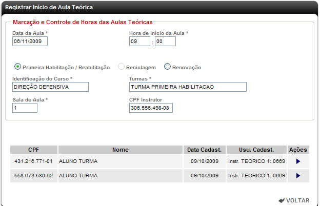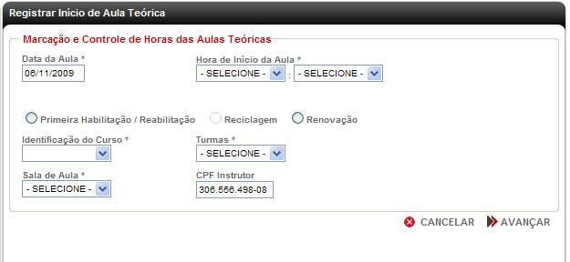 Registrar início da aula teórica Permite que um instrutor teórico registre o início de uma aula teórica para um ou mais cidadãos, utilizando uma turma cadastrada. Para o registro de aulas é necessário que a turma seja cadastrada previamente e todos os cidadãos que serão incluídos na aula estejam cadastrado na turma que será utilizada. As aulas só podem ser registradas até 49 minutos antes e 30 minutos após