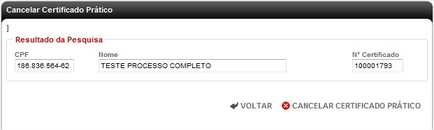 Cancelar Certificado Prático Neste item o sistema permite que o usuário cancele o número de certificado gerado a um cidadão, devido a alguma irregularidade. 1-Para cancelar o certificado, o usuário deve informar o número do CPF do cidadão e do certificado emitido. |