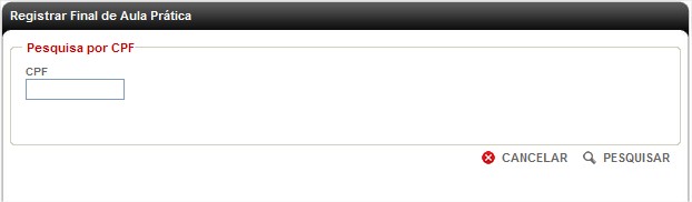 Finalizar aula prática Neste item o sistema disponibiliza para pesquisa o campo CPF de alunos. O usuário irá informar o CPF do aluno que teve a aula concluída e selecionar a opção “Pesquisar” em seguida o sistema apresentara a tela para registra o encerramento da aula prática, após o preenchimento selecionar a opção “Encerrar” o sistema atribuirá automaticamente o horário em que se encerrou a aula de acordo com o horário do servidor. |