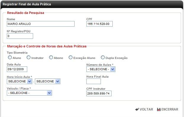 1- Para registrar o termino da aula, o usuário deverá informar o CPF do aluno e selecionar "pesquisar", em seguida a verificação biométrica do instrutor será solicitado, o sistema irá retornar os dados do aluno e os dados da aula iniciada. |
