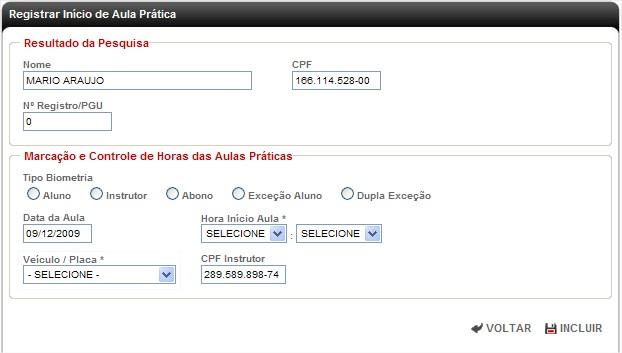 2- Após informar o CPF do candidato e clicar em pesquisar, a impressão digital do instrutor será verificada, em seguida o sistema irá demonstrar os dados cadastrais do candidato e solicitar que seja registrada a aula. Para registrar uma aula, devem ser informados os seguintes dados: