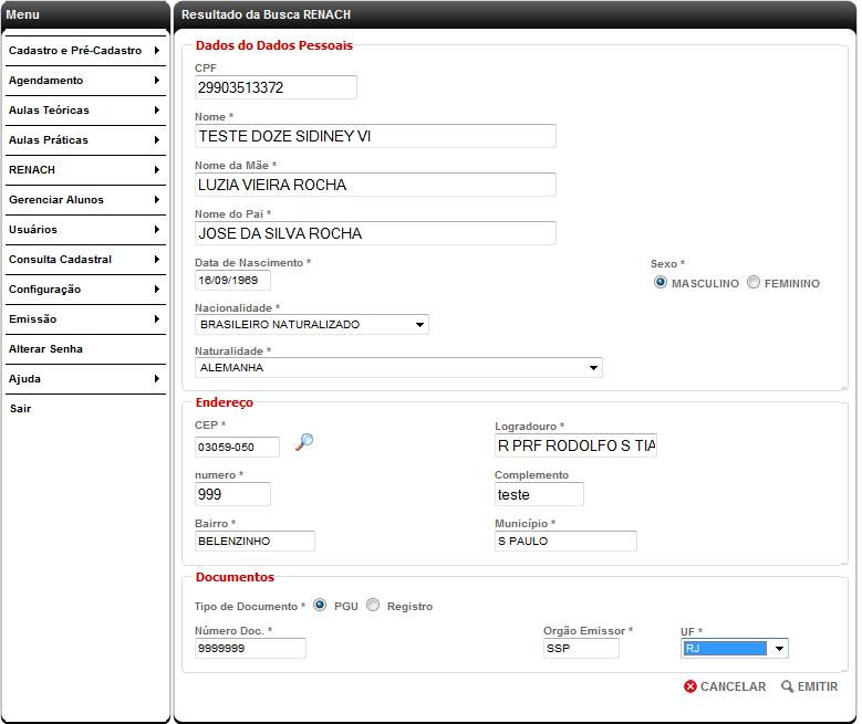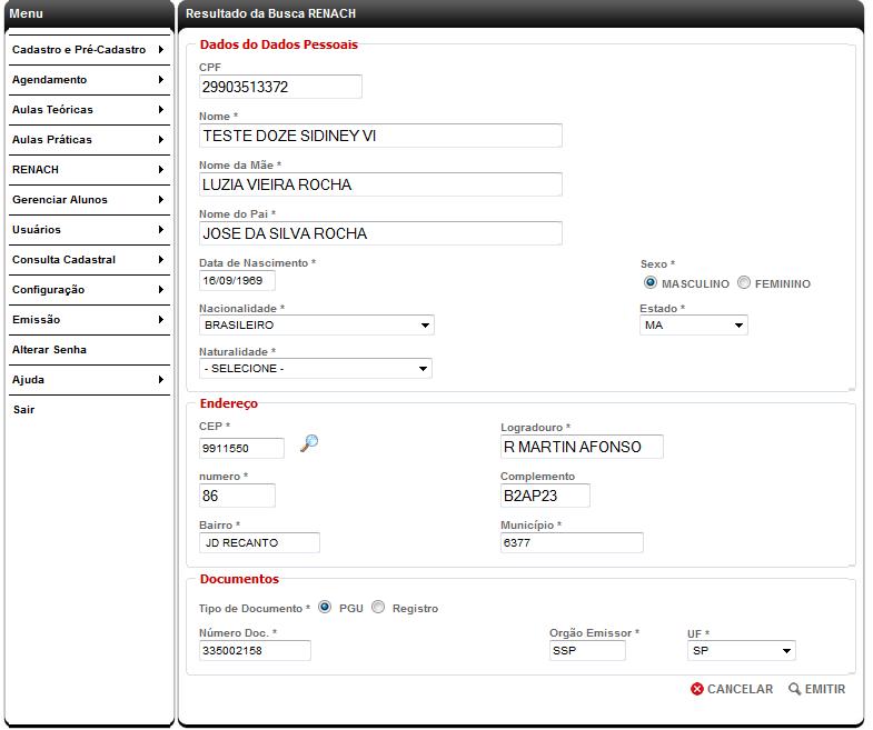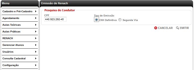 Regras Gerais 1- Informar o CPF do cidadão que está solicitando o documento 2- Selecionar o botão “CNH definitiva” entre as opções de Tipo de Emissão 3- Clicar em EMITIR 4- Se as condições para aceite da solicitação forem atendidas, será exibida uma tela contendo os dados do cidadão e da sua CNH conforme se encontram cadastrados, e no final do formulário as opções de CANCELAR e EMITIR. 5- Se o usuário deseja alterar algum dos dados do cidadão que a função permite alterar ele deve posicionar o cursor no campo, digitar a informação atualizada e comprovada pela documentação apresentada pelo cidadão, e seguir acionando a tecla de tabulação até completar as alterações necessárias dos dados alteráveis. 6- No final do formulário o usuário deverá selecionar a opção EMITIR e será exibida a mensagem contendo o número do RENACH gerado*, com a sequência do processo idêntica à geração de RENACH de 2ª via descrita anteriormente. É importante lembrar que: