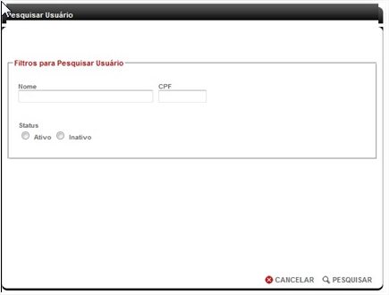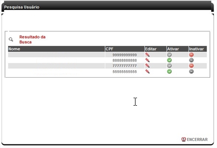 Pesquisar Usuário Neste item o sistema permite que seja realizado uma consulta de usuário, informando o nome, CPF e Status do usuário. Ao consultar o sistema irá demonstrar o usuário proprietário do CPF, permitindo que ele seja inativado, ativado ou editar alguma informação que seja de sua necessidade. |